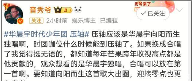 这个设定引发了部分华晨宇粉丝和业内博主的不满,认为真正意义上的压轴应该是华晨宇《向阳而生》的独唱,时代少年团的咖位不足以压轴。粉丝则斥责节目组为了捧时团,让华晨宇牺牲太多。